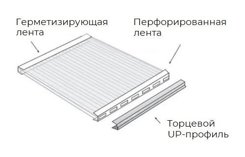 Перфолента и гермолента используется для герметизации торцов СПК. Верхняя часть поликарбонатных панелей закрывается гермолентой, а нижняя перфолентой.
