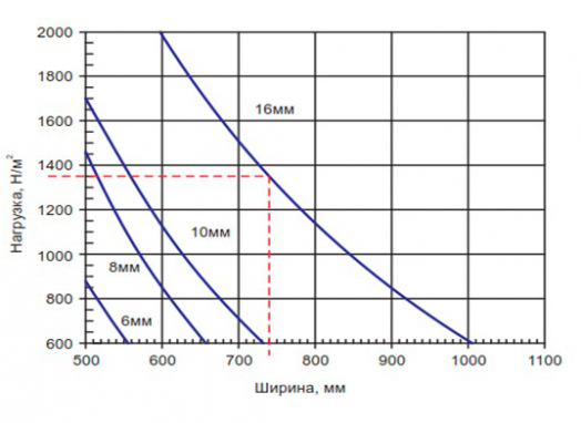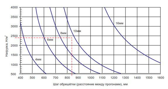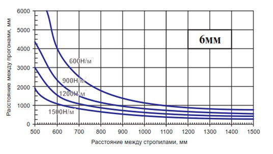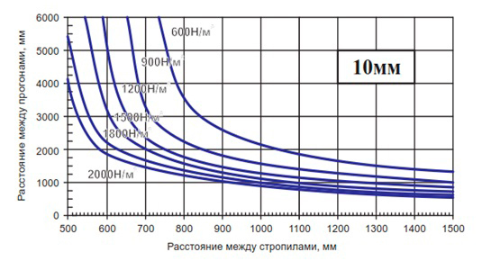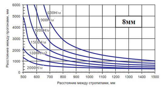 По диаграммам № 3−5 можно рассчитать максимальное расстояние между стропилами и прогонами для различных толщин панелей.